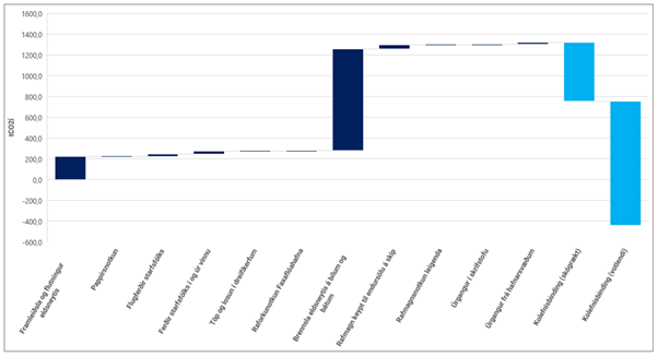 Á myndinni hér að ofan, sem kemur úr grænu bókhaldi 2022, má sjá hvernig kolefnislosun dreifist á umföng. Eins og myndin sýnir skýrt er uppruninn að mestu frá brennslu jarðefnaeldsneytis ásamt framleiðslu og flutningi þess (dráttarbátar, bifreiðar og akstur starfsmanna til/frá vinnu). Notkun eldsneytis jókst milli áranna 2021 og 2022. Árið 2022 var útblástur gróðurhúsalofttegunda vegna bruna jarðefniseldsneytis um 975,9 tCO2Í sem er er 22% aukning á milli áranna 2021 og 2022.