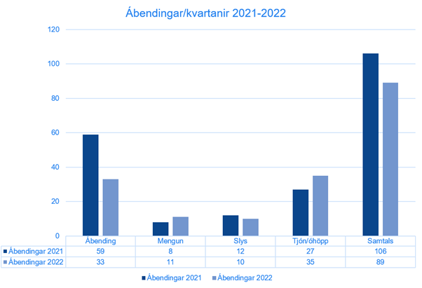 Hér á eftir má sjá tölfræði skráðra ábendinga sem brotnar eru niður á helstu málaflokka samanborið við 2021.