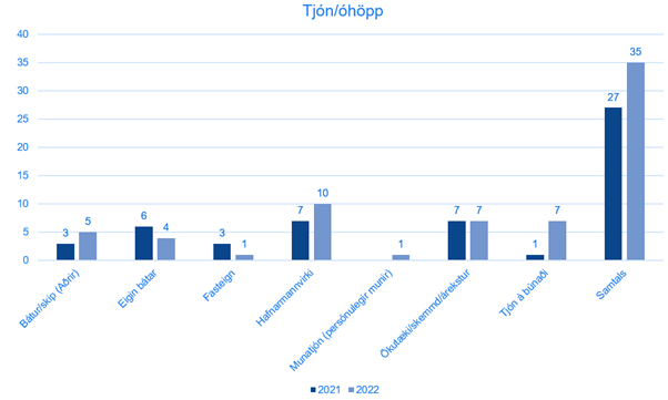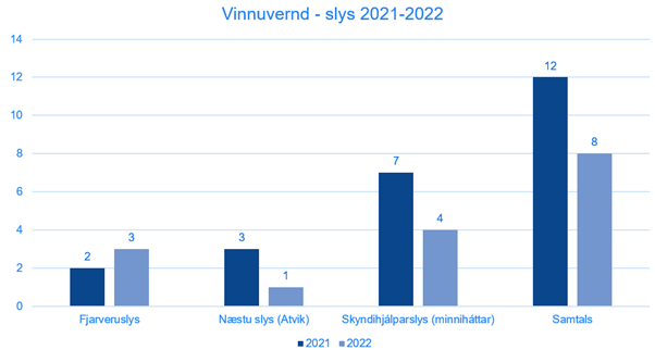 Slys voru 10 sem er fækkun frá 2021. Lögð hefur verið áhersla á að öll atvik séu skráð. Af þessum 10 slysaatvikum voru þrjú fjarveruslys.